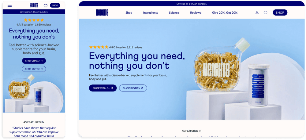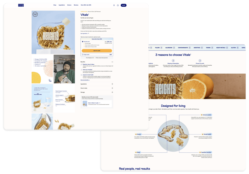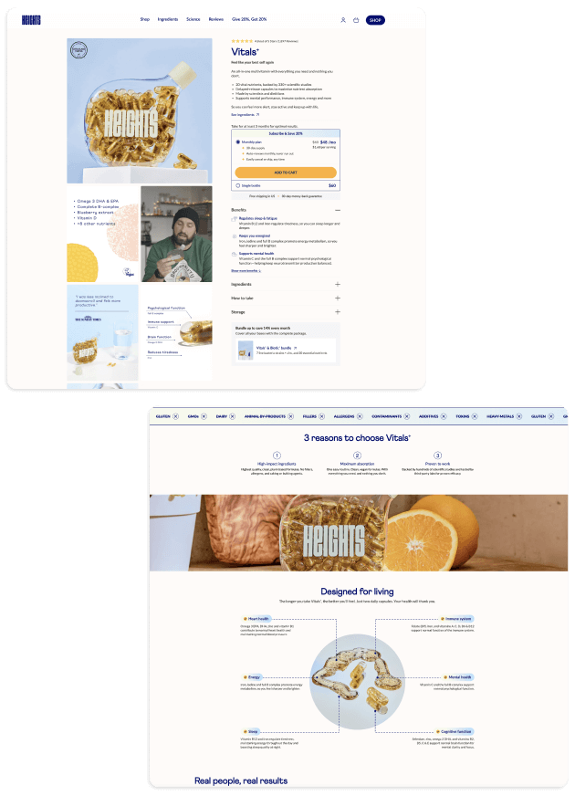The redesign process involved an in-depth study of their competitors' existing user interface and user experiences to identify areas of improvement and to create a more engaging and conversion ready website. The project also included the development of a custom theme to facilitate easy changes and content updates for the Heights team, product bundling to accommodate their expanding product line, new product photography, and animated charts to visually illustrate the science and research that went into the product.