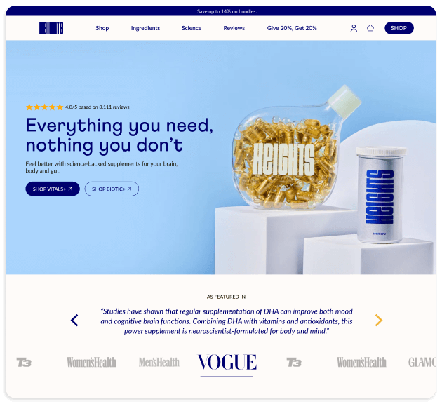 The development of the custom theme for Heights was completed in a tight 40-day timeframe. Utilizing the flexibility of Shopify Plus, our team built a theme that could effectively handle the company's expanding product line and complex bundling requirements. The theme was designed with a strong emphasis on the subscription business model, ensuring a smooth user experience for customers. This rapid development was made possible by our team's focused approach and efficient collaboration, delivering a theme that not only met but exceeded the expectations set for the project.